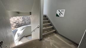 非常階段:当マンションは、4階にエントランスがあり、そこから2階まではエレベーターを利用できます。2階から当物件のある1階にはこの階段を利用します。照明は人感センサー付きです。