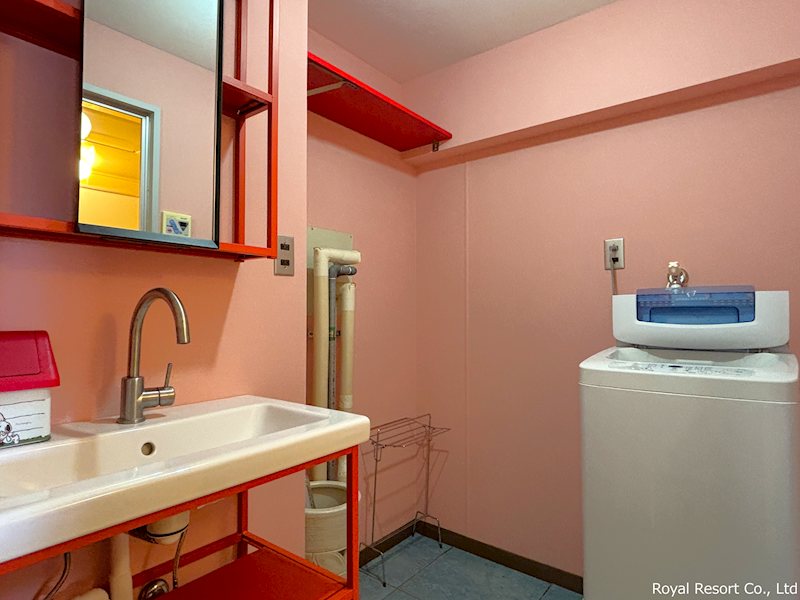 【洗面所】やわらかなピンク色が印象的な洗面所は、どこか懐かしさと温かみを感じさせる空間です。