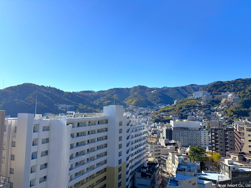 【景色を望む】最上階14階からの眺めは、視界が大きく開け、熱海の街並みと空の広がりを一望できる開放的な景色。