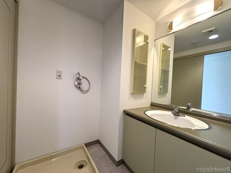 洗面室の洗面台と洗濯機置場。洗面台には大きな鏡があります。