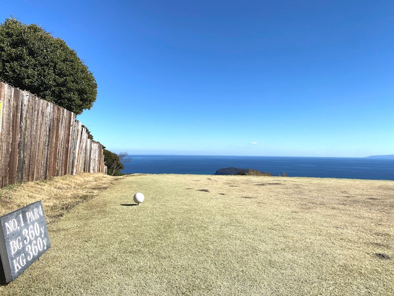 湯河原カンツリー倶楽部1番ティーグランド。相模湾に向かってナイスショット。