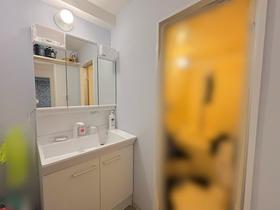 【洗面台】現オーナー様が新調しております。(令和7年9月)奥はお浴室ですが大浴場があるため物置代わりにされております。