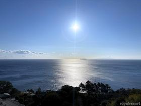 お部屋から真正面の眺望。海面に太陽の光が反射して輝く美しいサンロードが奇麗です。