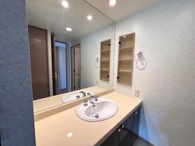 大鏡を設えた洗面化粧台のある洗面室。