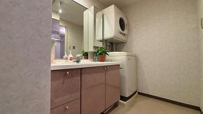 【洗面室】化粧品や小物などの収納に便利な大型三面鏡を設置。洗濯機置場も付帯しております。
