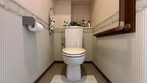 【トイレ】クロスの雰囲気がレトロな印象。奥行もあり段差もありません。