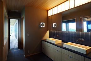 【洗面所】やわらかな木の質感と自然光が調和した、檜を用いたダブルシンクのオーダー洗面。