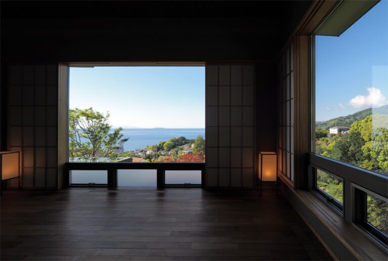 【リビングから広がる景色】どこまでも続く碧の海と、島々、そして伊豆半島の稜線。季節の移ろいがそのまま室内へと入り込みます。