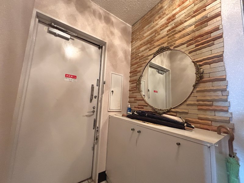 玄関入ってすぐにタイルの壁面がお出迎え。