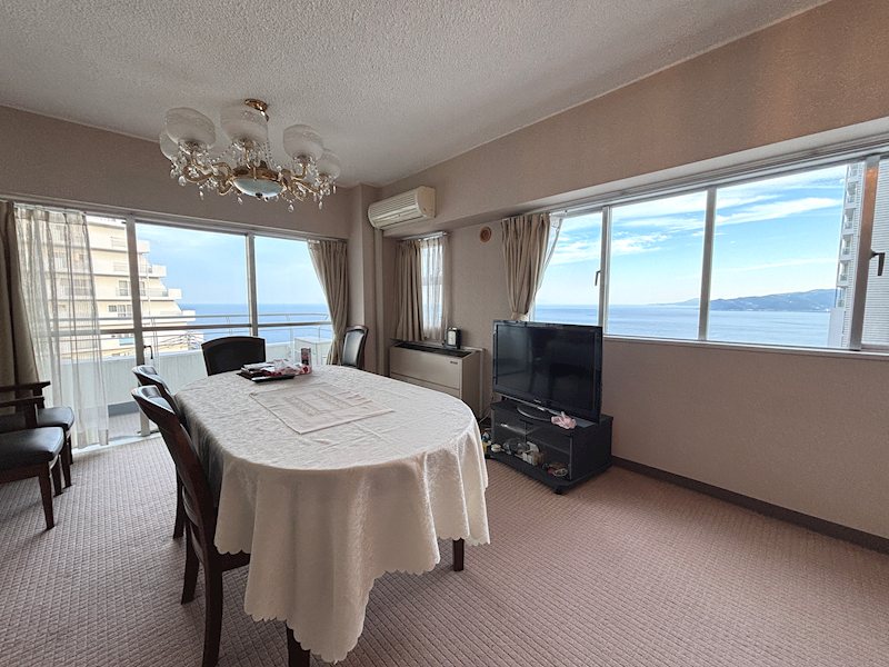熱海駅から徒歩5分、敷地面積約3000坪の雄大な敷地に聳え立つ老舗のマンションです。館内の静寂感が規律正しい印象で身が引き締まります。充実した管理、丁寧なフロント対応、セキュリティーは分譲時からオートロックシステム採用、常駐管理、安心した暮らしができるマンションです。今回は7階の南東角部屋3LDKのお部屋をお預かりいたしました。リビングから見える相模湾に大人数でも利用しやすい面積、部屋数となっております。いつでもご案内可能ですので是非お問い合わせください。