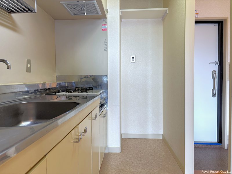 【キッチン・別角度】キッチンはリビング側・廊下側の両方から出入り可能。生活動線が分かれ、使い勝手の良い間取りです。