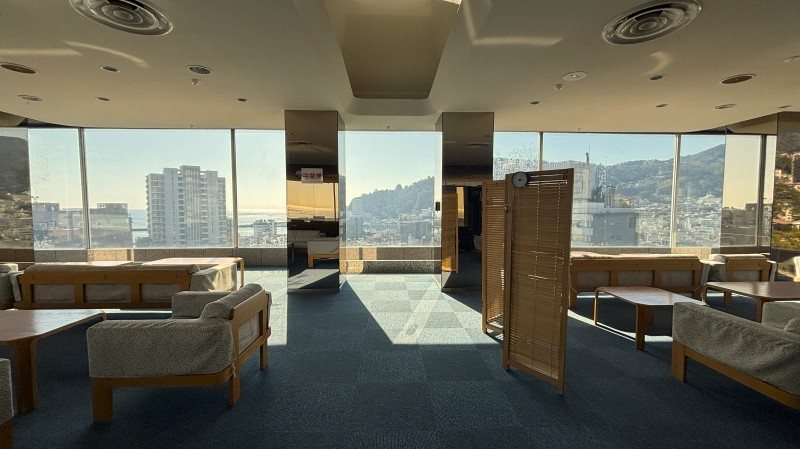 展望ラウンジ:熱海市街地を一望します。海上花火大会、海、山の稜線を望みます。