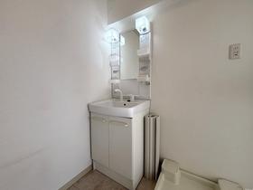 【洗面所】コンパクトで清潔な洗面台がついております。右には洗濯機を置くことができます。