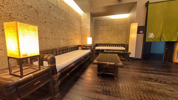 お風呂上りに一息つける湯上りラウンジ。2種類の温泉大浴場と予約制のプライベートスパがあります。