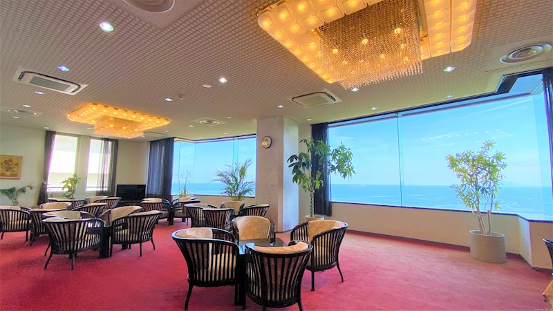【ロビーラウンジ】華やかな雰囲気で、窓の向こうには海を見下ろす景色が広がります。