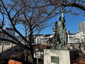 あたみ桜の早咲きで有名な釜鳴屋平七像。