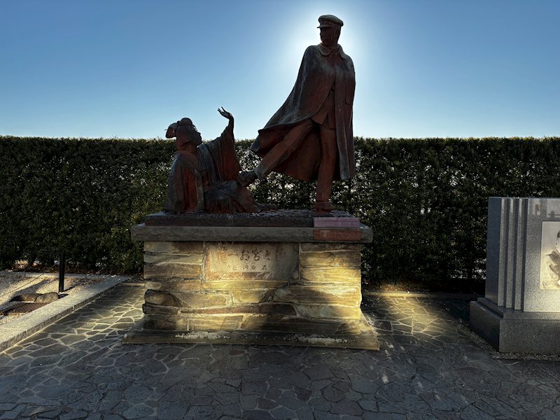あたみ桜の早咲きで有名な釜鳴屋平七像。