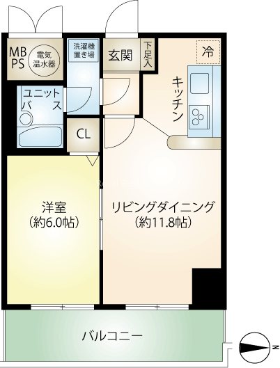 洋室:約6.0帖の広さ。リビングダイニングと一体感を持たせることもでき、ワンルームとしても利用出来そうです。