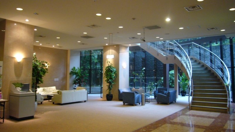 ロビーは吹抜けを採用し、大きく採ったガラスウィンドウの先には滝が流れております。