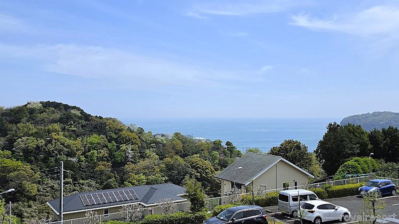 御覧の様に、このマンション内の駐車場越しに海を望みます。