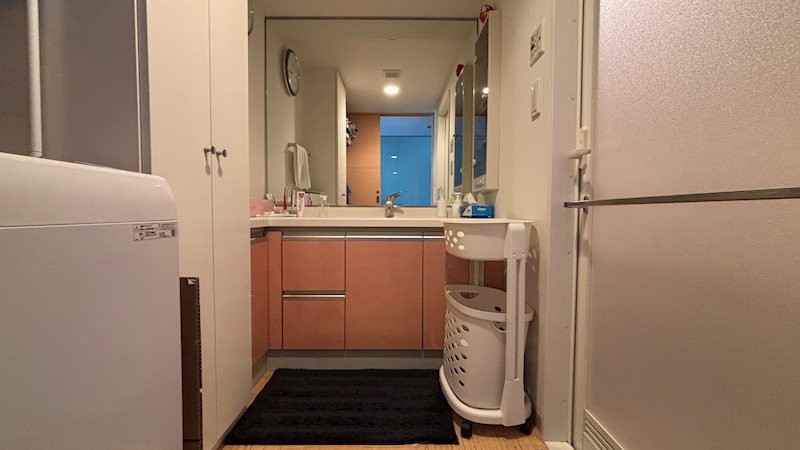 【洗面室】大きな鏡が印象的な洗面室です。