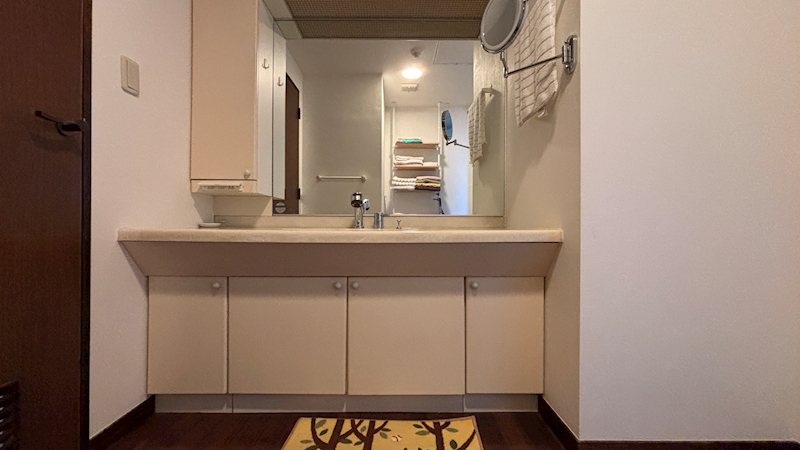 【洗面室】大きな鏡の洗面器となります。