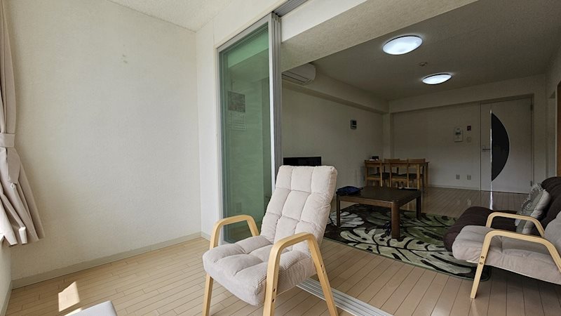 透明のアクリルの仕切りでリビングと仕切っているサンルーム。