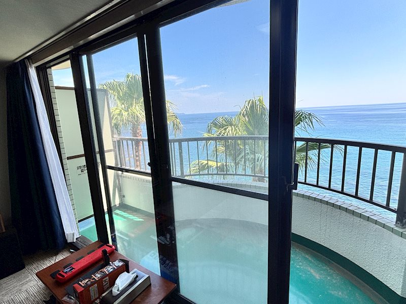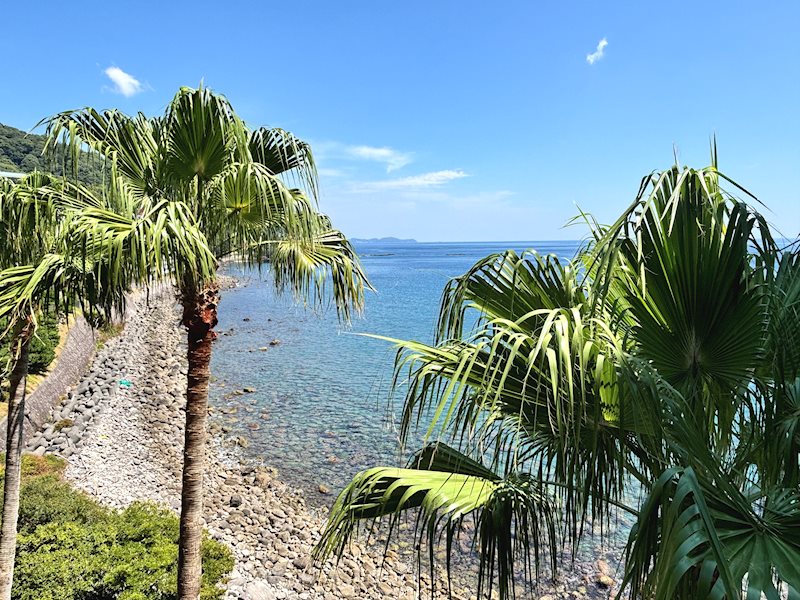 🔷綺麗な相模湾の波打ち際と南国気分の溢れるヤシの木を望む