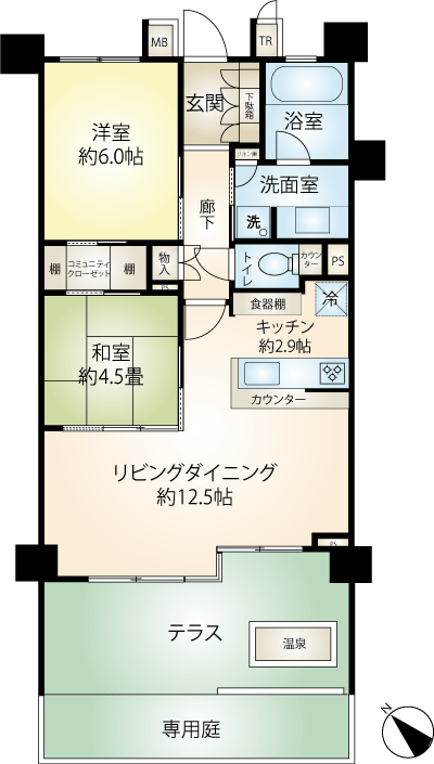 | 共用施設 | サウナ付き温泉大浴場/露天風呂/家族風呂300円/回/ゲストルーム/プレイルーム/ラウンジ/宅配ロッカー/トランクルーム/ペット足洗い場 |
