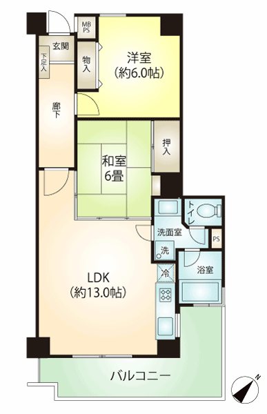 専有:61.02m² / 間取り:2LDK 平成4年(1992年)4月 / 10階だての5階
