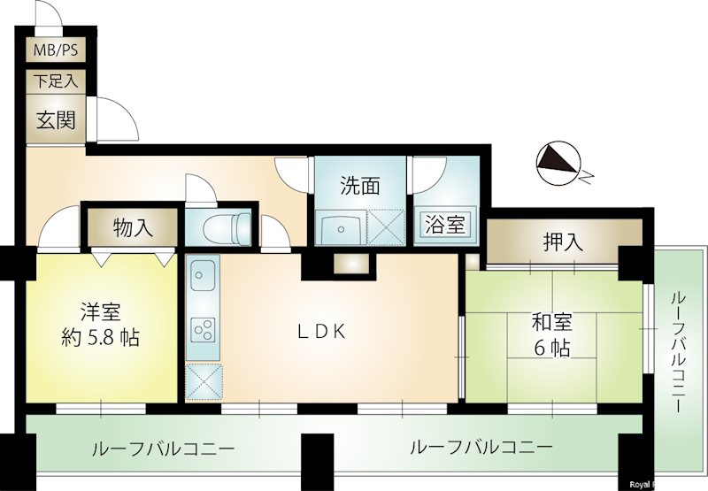 専有:60.69m² / 間取り:2LDK 平成1年(1989年)2月 / 9階だての7階