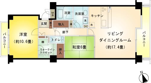 専有:86.34m² / 間取り:2LDK 平成2年(1990年)6月 / 6階だての2階