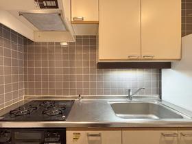 【キッチン】時期は不明ですが、コンロは交換されています。3口のガスコンロが備わります。