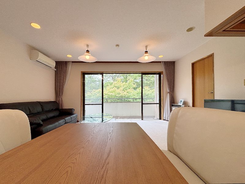 【リビング】キッチン側からバルコニー方向を撮影。居心地の良いリビングです。