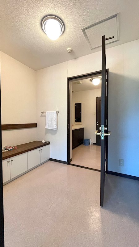 脱衣スペースです。腰かけられるのも便利です。