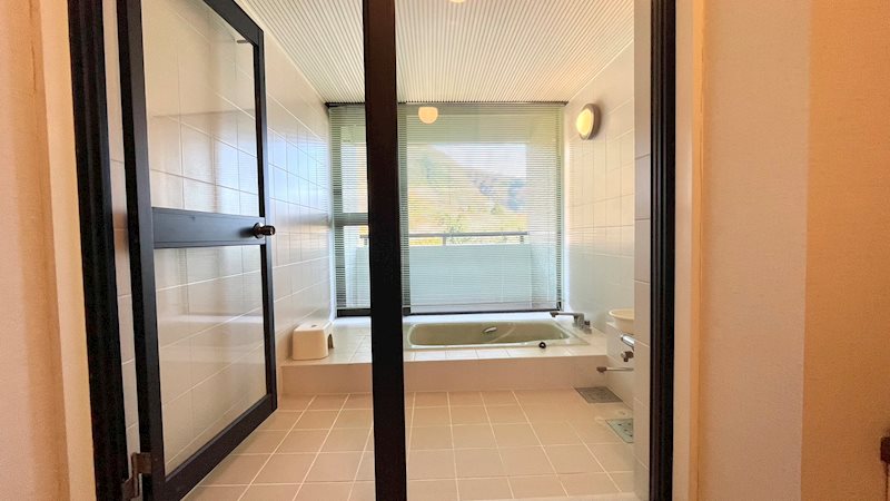 お部屋のバスルームは、ビューバスになっています。温泉ではございませんが、広くて良いです。