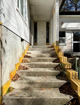 こちらの階段から建物玄関に進みます。床コンクリートに歪み、傾きがございます。ご承知おきください。