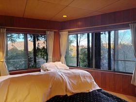 【洋室2】二面の窓から緑豊かな敷地内の樹々、その向こう外輪山の山々を望みます。