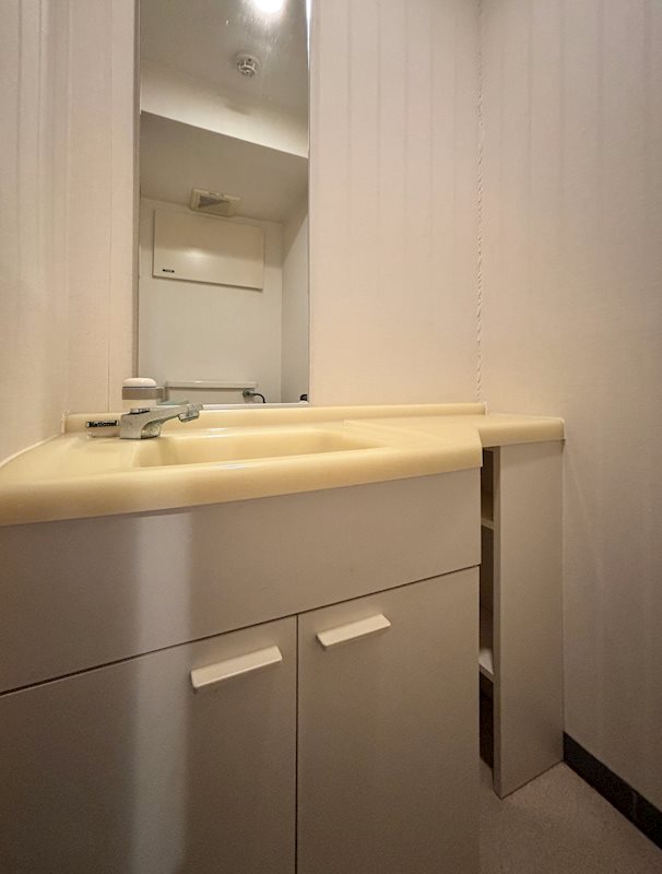 【洗面脱衣室】大きな鏡が印象的な洗面台がございます。