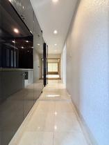【玄関】室内側から玄関扉方向を撮影。奥行のある造りです。収納は光沢ある建具で統一されています。