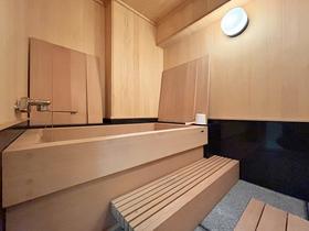 【浴室】檜造りの豪華な浴槽が備わります。大浴場だけでなくお部屋のお風呂も十分にお楽しみいただけると思います。