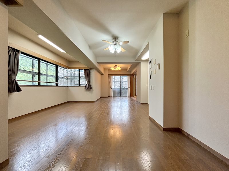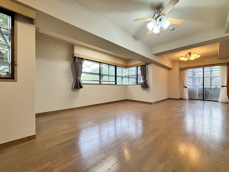 【LDK】約21帖のLDKです。角部屋のため窓が多く、明るい印象がございます。また、窓を開けますと心地よい風を感じられます。