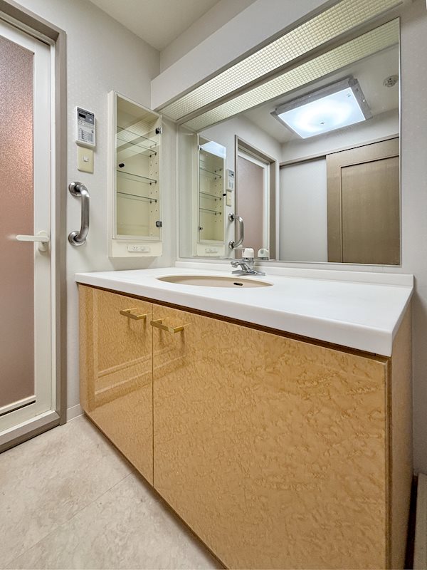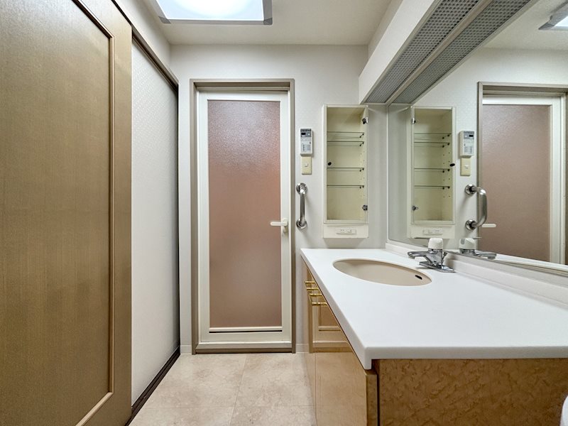 【洗面脱衣場】使い勝手の良いサイズ感の脱衣場は、右手後ろに洗濯機置き場もございます。