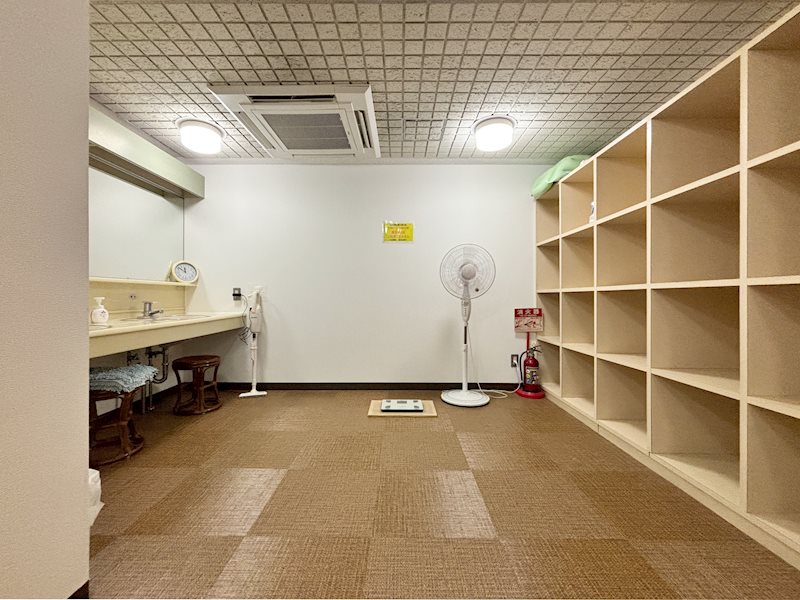 【露天風呂付温泉大浴場】1番館には露天風呂付温泉大浴場がございます。こちらは大浴場脱衣場のお写真です。