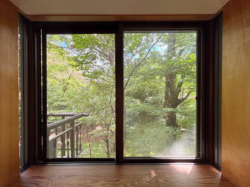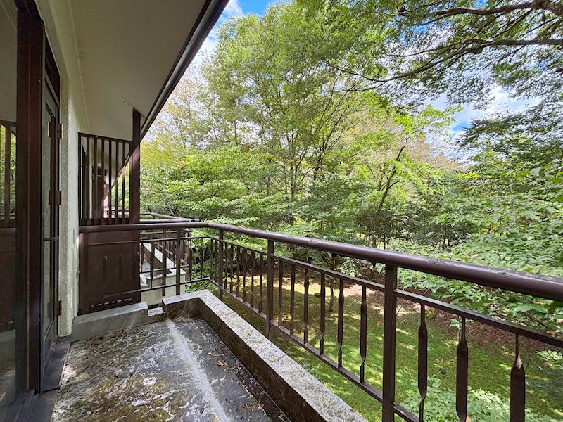 【眺望】バルコニーからは緑が美しい森林を望みます。様々な小鳥の囀りをお愉しみください。