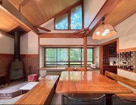 リビングから臨む四季折々のパノラマ絶景、緑の木々に囲まれたこの別荘で家族は愛犬とともに楽しい日々を過ごしました。