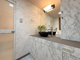 【洗面脱衣室】2020年のリフォームで、大理石調のシートに変更されました。ホテルライクな仕上がりです。