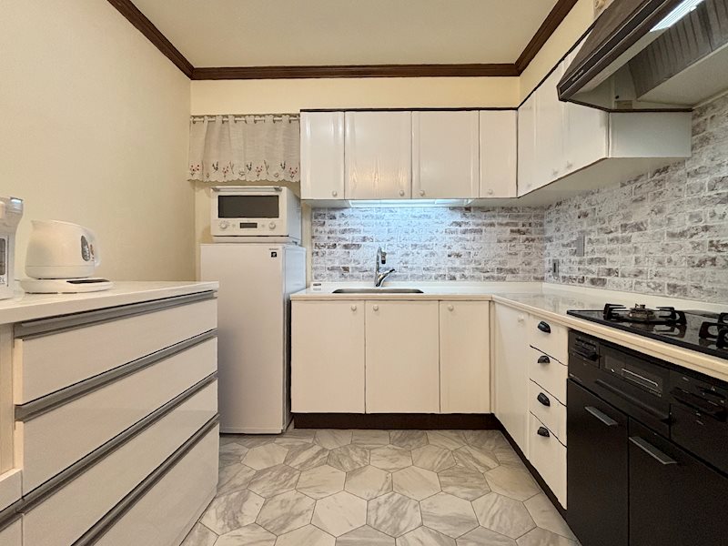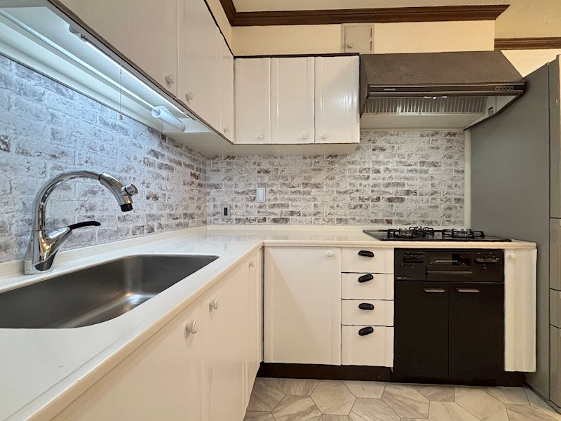 【キッチン】L字型、作業スペース広めのシステムキッチン。化粧シート張施工で、大変綺麗な仕上がりです。