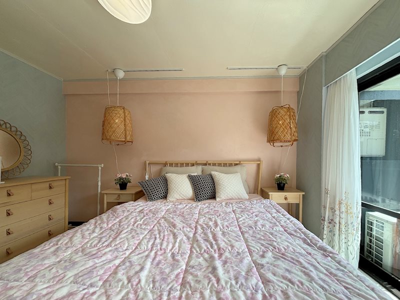 【洋室】約7.6帖の洋室は、暖かみのあるピンクの珪藻土が塗装されています。
