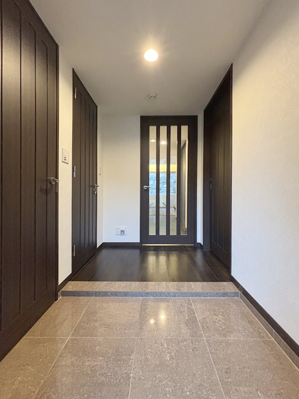 【玄関】艶やかな石タイルの玄関にはシューズインクローゼットが備わります。